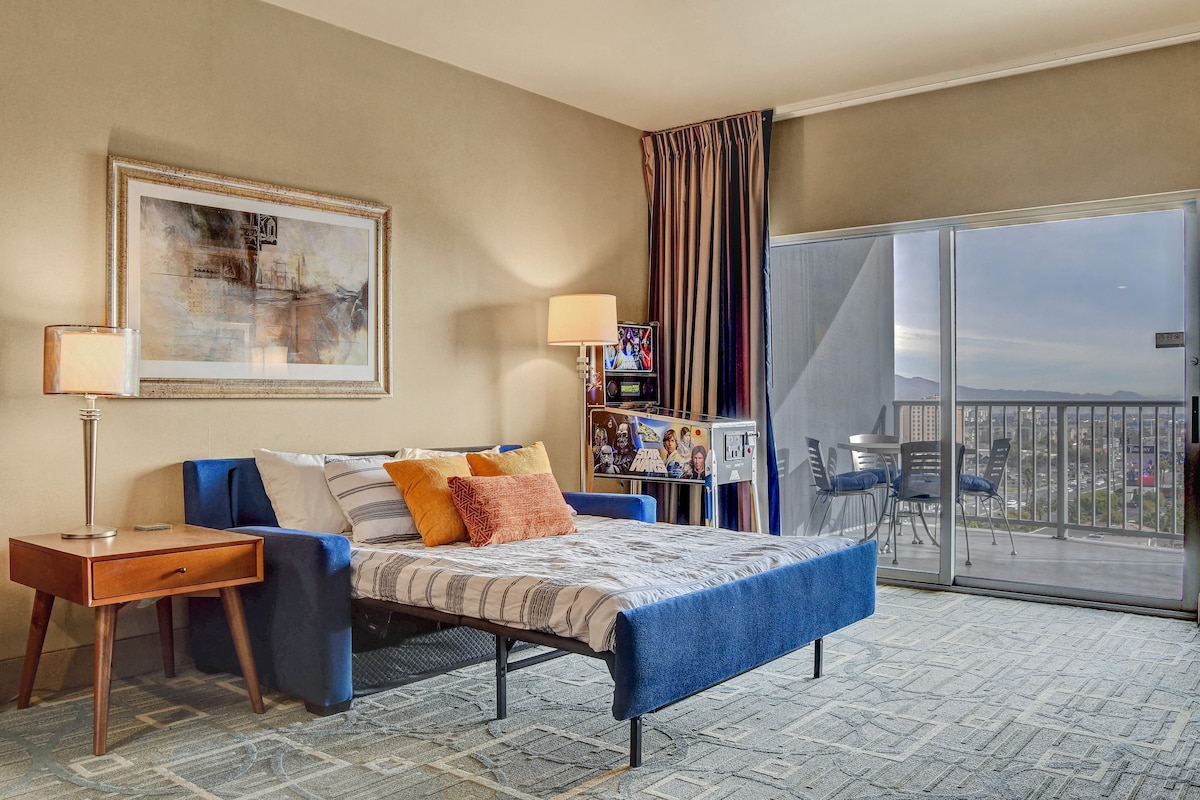 Esta suíte de 1 quarto de 835 pés quadrados está totalmente equipada e perfeita para indivíduos ou pequenos grupos que querem a experiência de Vegas, enquanto também desfrutam das comodidades de uma casa. Este estúdio luxuoso é espaçoso e acolhedor, com uma vista inacreditável. Este estúdio acomodará até 4 hóspedes com uma cama king size e um sofá-cama de tamanho completo. • SEM TAXA DE RESORT • Wi-Fi gratuito • Acesso à piscina e academia • A distância a pé da Las Vegas Strip e TopGolf • Estacionamento gratuito