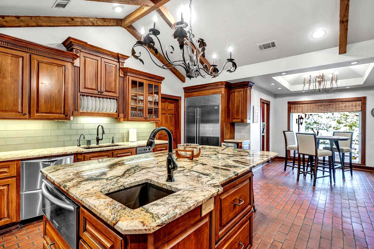 Welcome to our private oasis nestled within the city limits! This 4400 sqft home, 10-acre estate sleeps 10 and features a gourmet kitchen, pickleball, private 2-acre pond w/ covered dock, swimming pool, spa and fire pit. Relax in the screened patio, 2 family rooms, and a master bedroom fit for royalty. With an office and laundry, this retreat offers both luxury and convenience. The backyard is canopied under huge oak trees, resembling a beautiful park. Only 1-mile from shopping and restaurants.