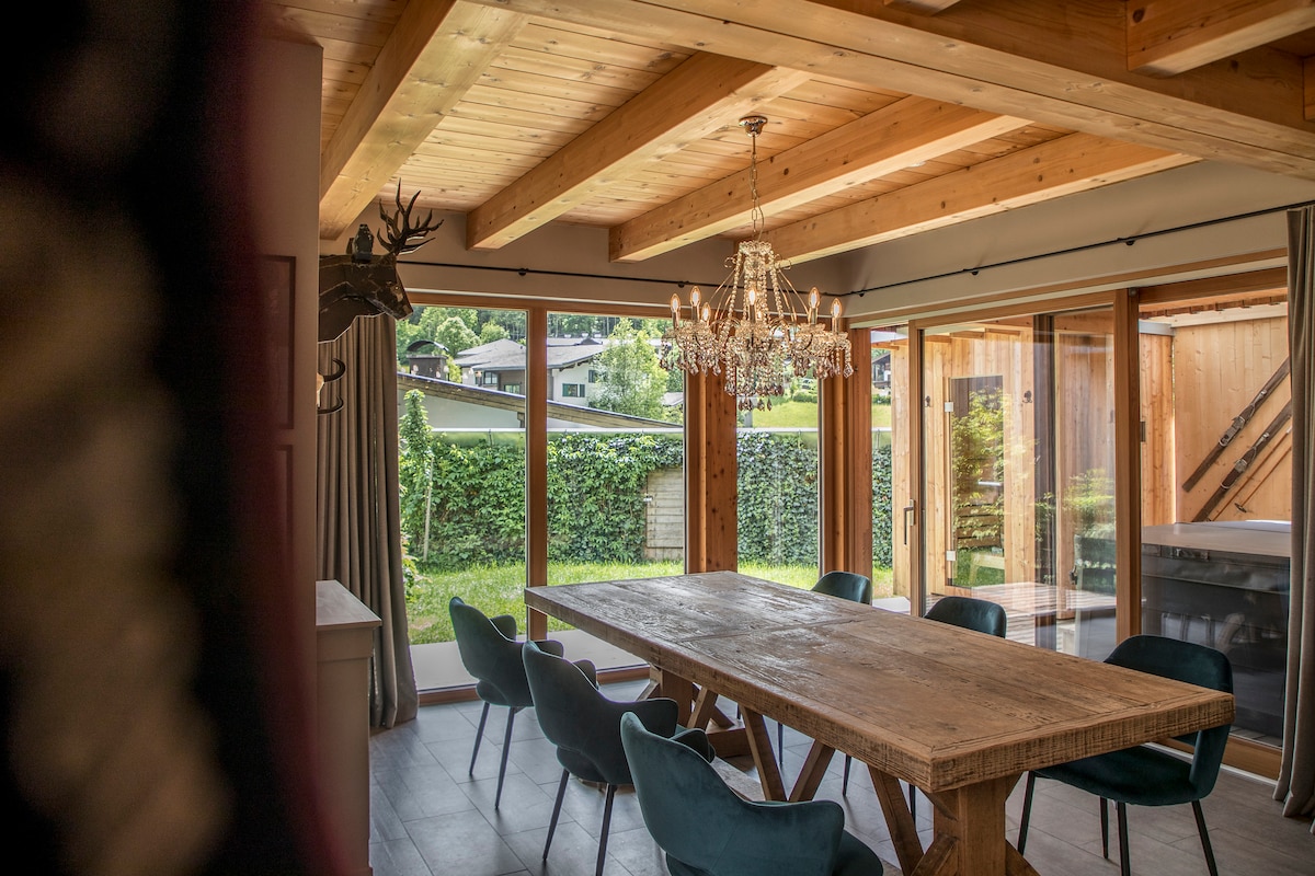 Bem-vindo à sua vila exclusiva em um chalé no Kaiserwinkl tiroles - um lugar para momentos especiais. Com 362 m², esta casa de luxo combina elegância alpina com os confortos mais modernos. Seja como uma grande família, várias famílias de amigos, seminário ou grupo de retiro: até 18 hóspedes podem encontrar retiros elegantes e espaçosas áreas comuns aqui. Desfrute de bem-estar com uma sauna, sala de jogos com bilhar e tênis de mesa, cinema, biblioteca e a paisagem montanhosa deslumbrante do Wilder Kaiser.