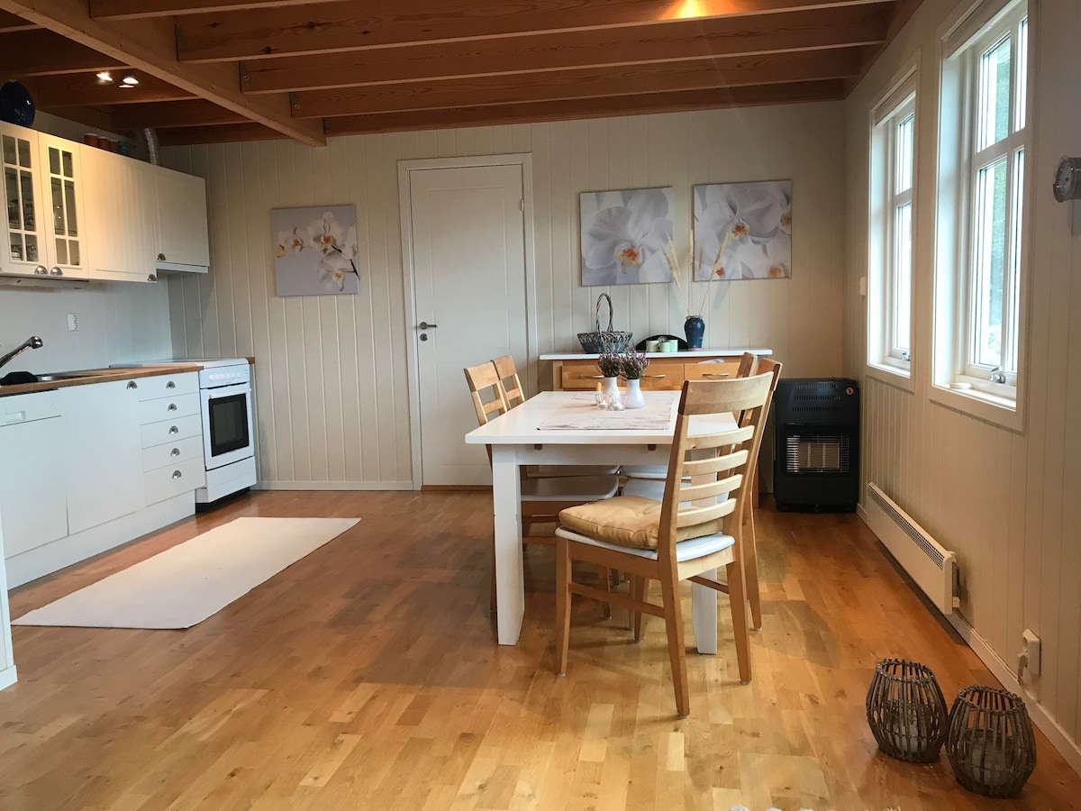 Nedstrand. O chalé está localizado ao lado do caminho para Himakånå, e tem boas oportunidades de caminhada. A propriedade é cercada, tornando o lugar seguro para crianças. A janela da sala de estar tem uma excelente vista para o mar. O quarto 1 tem 2 camas de solteiro. Quarto 2 camas 3: 1 beliche e 1 berço com comprimento 150 cm. Esteja ciente de animais pastando fora da propriedade. O estacionamento gratuito fica a cerca de 150 m da cabana, para chegar lá você tem que andar uma subida íngreme. Uma mala de carrinho não é recomendada, pois há uma estrada de cascalho.