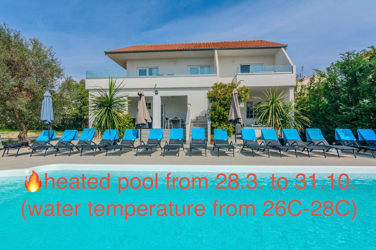 Genieße Deinen Urlaub mit deiner ganzen Familie und Freunden in dem ruhig gelegenen Örtchen Mletak, bei Privlaka. Die stilvoll eingerichtete Unterkunft verteilt sich auf 3 Stockwerke mit einem Garten, Balkon und einer Dachterrasse mit Meerblick. Entspannt gemeinsam zum Sonnenuntergang im Whirlpool oder verwöhnt Euch mit einem kroatischen Barbecue vom Grill. Lasst Euch tagsüber von der dalmatischen Landschaft verzaubern und erfrischt euch in der zu Fuß (150m) erreichbaren Adria.
