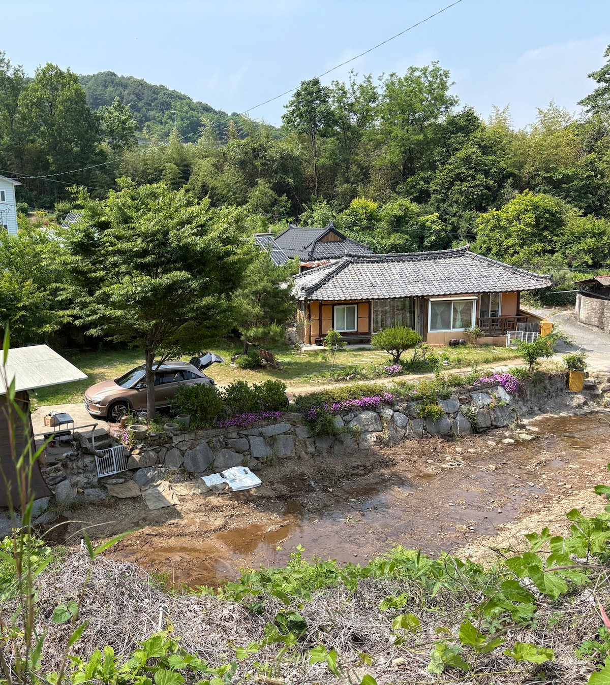 É uma casa de campo com várias árvores frutíferas localizada a uma altura de 420 m sob o Samdobong da Montanha Democrática, longe das movimentadas atrações turísticas do Parque Nacional Deokyusan e do Muju Resort. Demora cerca de 10 minutos para Taekwondo Won e Bandiland, e 25 minutos para Deokyusan Muju Resort. No interior da aldeia, você também pode apreciar a beleza natural do vale. A Uncle House é o edifício de estrutura de madeira de estilo americano mais isolado, projetado e construído pela prestigiada empresa de construção de madeira de Seul. O teto é alto, o verão é fresco e o inverno é uma casa quente, uma vista alta e ampla e um lugar quente para desfrutar da lareira com vista para as estrelas. O primeiro andar é o espaço do casal anfitrião, e o 56m2 (incluindo o terraço) no segundo andar é a casa de hóspedes. Tem uma entrada separada, e não é uma casa desconfortável porque há um anfitrião, mas é mais apreciado porque você pode obter ajuda e serviço imediatos. O churrasco estilo tio é um ótimo lugar para uma família americana, e as habilidades alimentares com a casa do tio são excelentes. A sala de sol com lareira privativa ao ar livre é de longe a melhor ♡