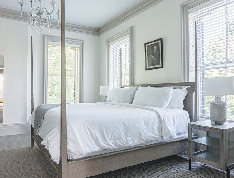 Guests seeking utter tranquility often request this light peaceful corner room that offers an ambiance of serenity, double exposure windows, queen-sized bed, butterfly sling chair, and a petite private bath. Please note that this is our smallest guest room and offers a super cozy stay with access to the second floor back door.