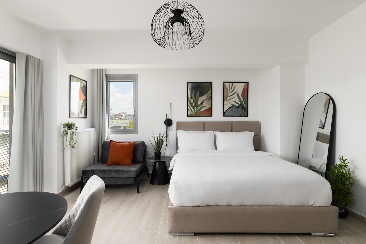 Estúdio elegante e inteligentemente projetado no coração da vida social de Tessalônica. Ideal para casais, solteiros ou viajantes de negócios Alta velocidade, Internet, colchão de alta qualidade, uma máquina Nespresso e Netflix. Máquina de lavar/secar, ferro e tábua de passar. Apenas 2 minutos da orla marítima e do porto, e a 5 minutos da praça Aristotelous.