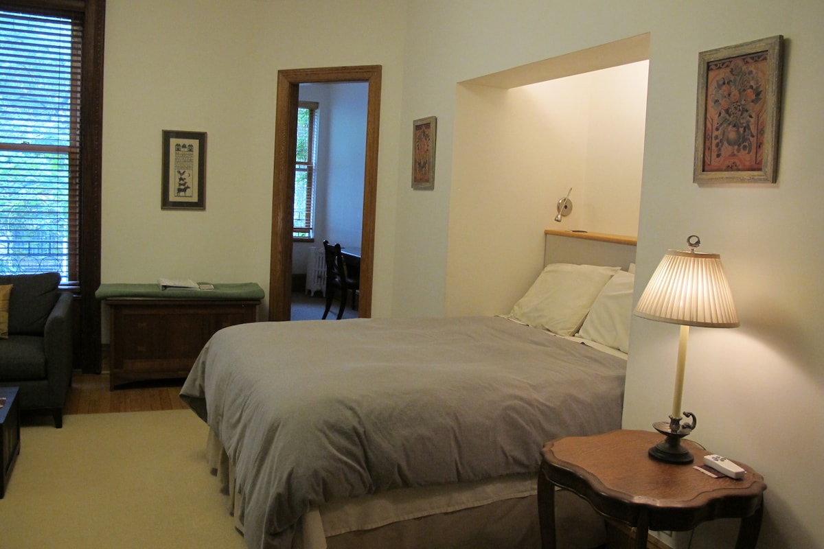Seu pied-à-terre em Sugar Hill, no bairro histórico de Jumel Terrace. Anteriormente uma livraria rara, a suíte do jardim ressoa com a história de Harlem Heights desde os Fundadores até nossa vibrante atualidade. Pense em privacidade, tranquilidade, autonomia e um jardim em flor. Curta caminhada, uma parada de metrô, para NY/Columbia-Presbyterian. Esta é uma casa de duas famílias. Totalmente compatível com as leis de aluguel de curta duração de Nova York. Anfitriões discretamente presentes durante sua estadia.