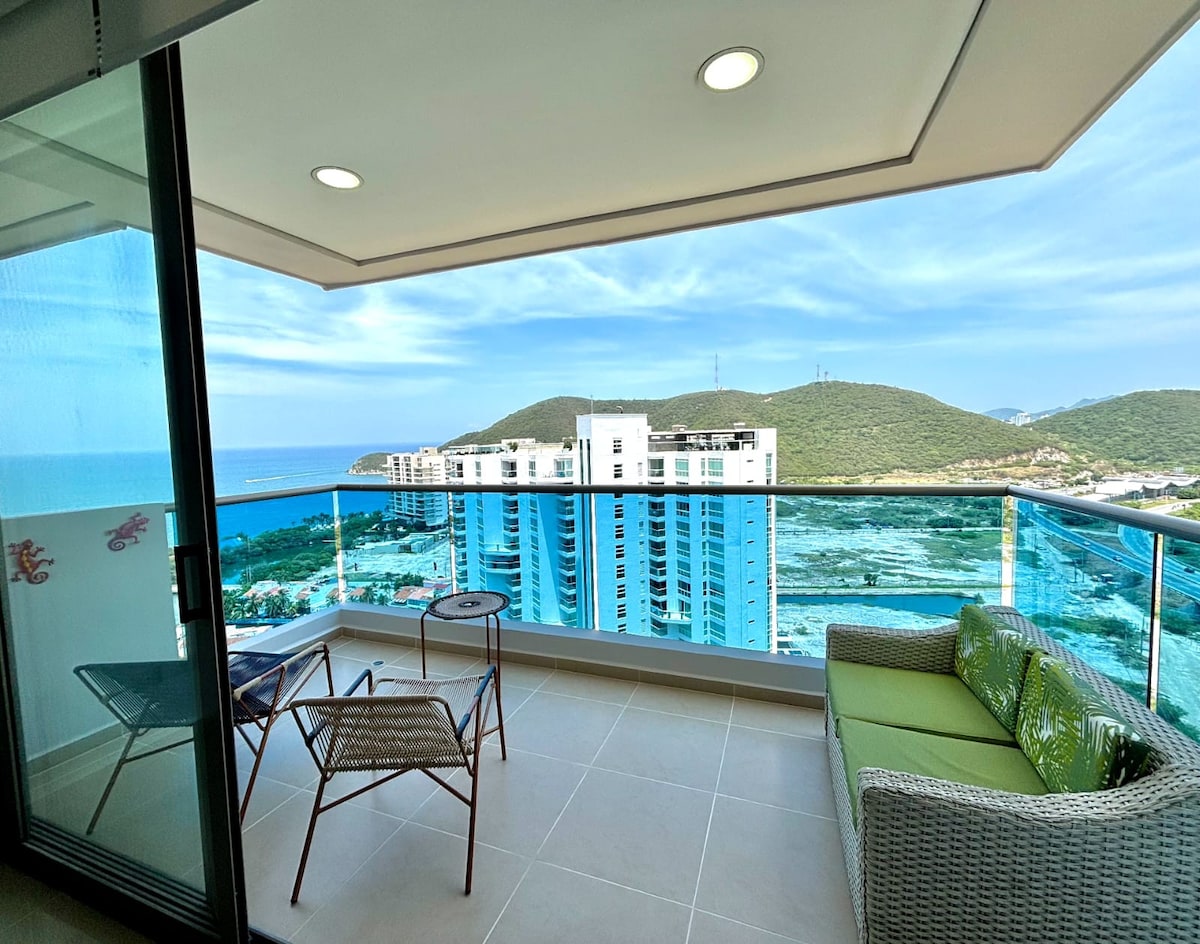 Disfruta un apartamento de lujo en la zona preferencial del Rodadero a tan sólo 15 minutos del aeropuerto internacional Simón Bolívar y a 10 minutos a pie del Rodadero, cuenta con salida privada a la playa, club de playa, zonas verdes con senderos ecológicos, terraza panorámica con zonas húmedas (Jacuzzis, bares, varias piscinas para adultos y para niños) entre otras amenidades como cancha de microfutbol, gimnasio, ping-pong, entre otras de estilo Resort para su disfrute.