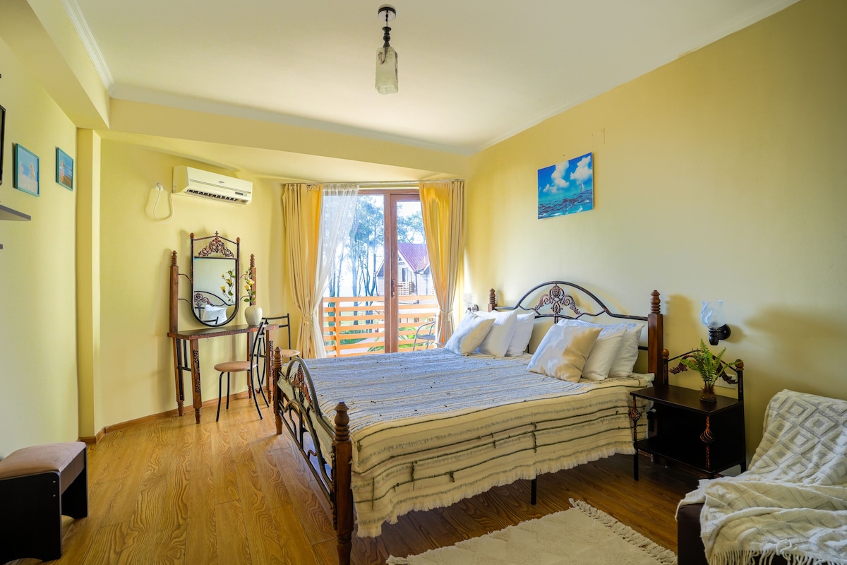 Welcome to Blue Escape – a calm, hotel-style room with balcony and access to a newly built shared drop pool surrounded by nature. Designed in soft blue tones, it’s perfect for solo travelers or couples seeking peace and comfort. Enjoy the fresh air, relax in a cozy bed, and stay connected with Wi-Fi and smart TV. While there’s no kitchen, great cafés are nearby. A quiet retreat just minutes from Batumi’s center.