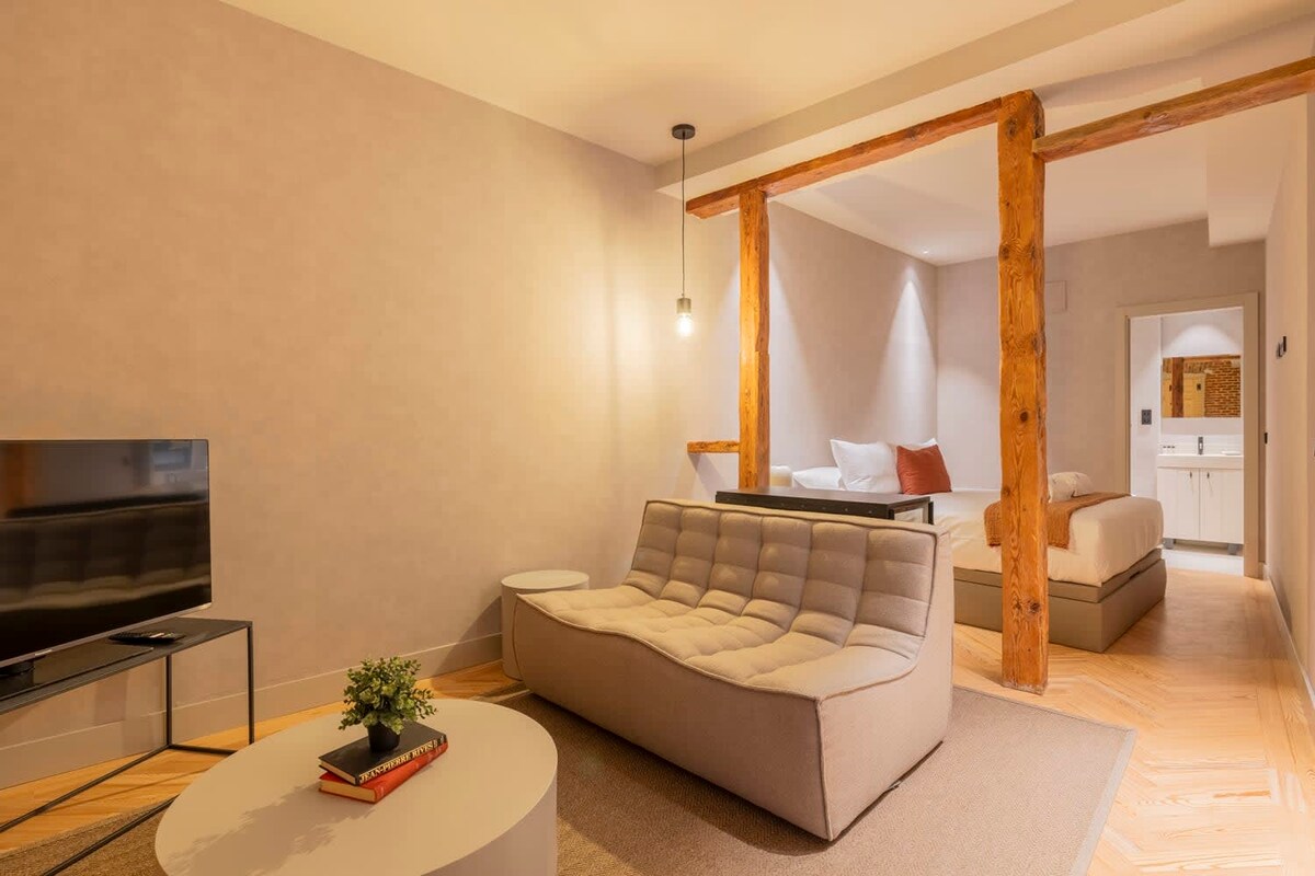 Magnífico apartamento de 45 metros quadrados no centro de Madrid. Com um design e decoração espectaculares, espaços amplos e tetos altos, o apartamento está equipado com tudo o que precisas para a tua estadia em Madrid. A sala tem três varandas para a rua que trazem uma grande luminosidade ao piso. O quarto tem o banheiro em-suite e uma secretária de trabalho. Desde o apartamento, podes visitar a pé quase todos os pontos emblemáticos de Madrid.