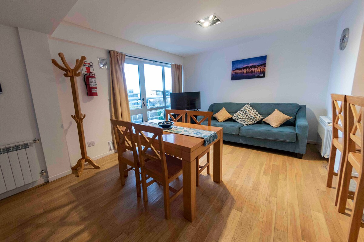 Novo apartamento para 2 pessoas (40 m² cobertos). Muito luminoso, silencioso e acolhedor, com aquecimento central regulável, bela vista da cidade, do canal de Beagle e das montanhas. Localizado a 15 minutos a pé ou 5 minutos de carro/táxi do centro da cidade (Avenida San Martín) e a 15 minutos de carro/táxi do Aeroporto Internacional Malvinas Argentinas. **Esclarecimento importante** O EDIFÍCIO NÃO TEM ELEVADOR - Você tem que subir 2 andares com escada.