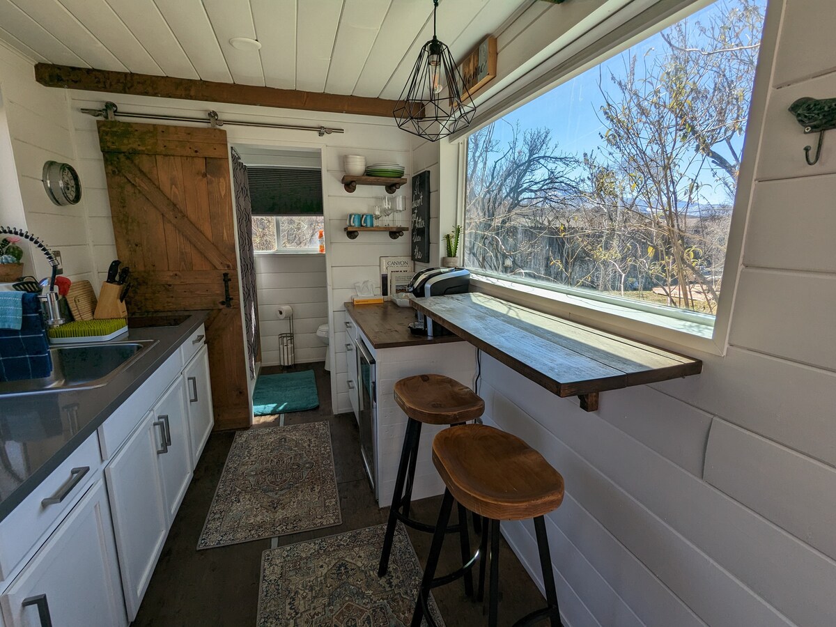 Experimente nossa luxuosa microcasa, aninhada na zona rural do sul de Utah, penhascos de rocha vermelha à distância, paisagem movimentada da Via Láctea, em uma pequena aldeia tranquila na beira do Parque Nacional Capitol Reef. De longe, a Casa Tiny parece meio... minúscula - mas uma vez lá dentro, há uma sensação de espaço e luz - tetos altos e muitas janelas. É realmente ideal para 1-2 pessoas, mas há um sofá-cama confortável, bem como para uma terceira pessoa, e um longo banco acolchoado para uma quarta. Grande deck para observação de estrelas!