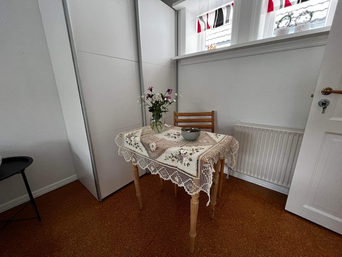 O apartamento foi renovado e é aquecido com energia verde (ar para água) e tem uma vista muito boa, com a possibilidade de usar um grande terraço, que tem vista para quatro ilhas, o apartamento está centralmente localizado entre o aeroporto e Thorshavn, tem uma boa distância a pé para Trælanýpa e Trøllkonufingur. Gásadalur/Múlafossur está localizado na ilha e tem uma conexão regular com Mýkines. Existem boas opções de estacionamento.