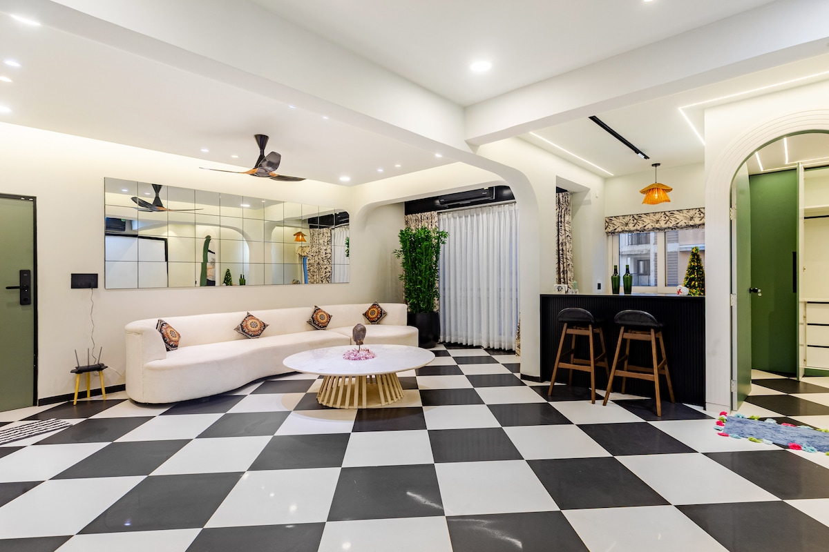 Experience refined comfort in the heart of Fontainhas, Panjim’s most vibrant, and historic quarter. This elegant neo – Art Deco apartment blends boho chic with premium design, offering a luxurious and intimate stay for up to four guests. Every detail exudes elegance and ease. Step outside to Goa’s culinary heart – beside one of India’s Top 100 restaurants, and moments away from seven more acclaimed dining gems.