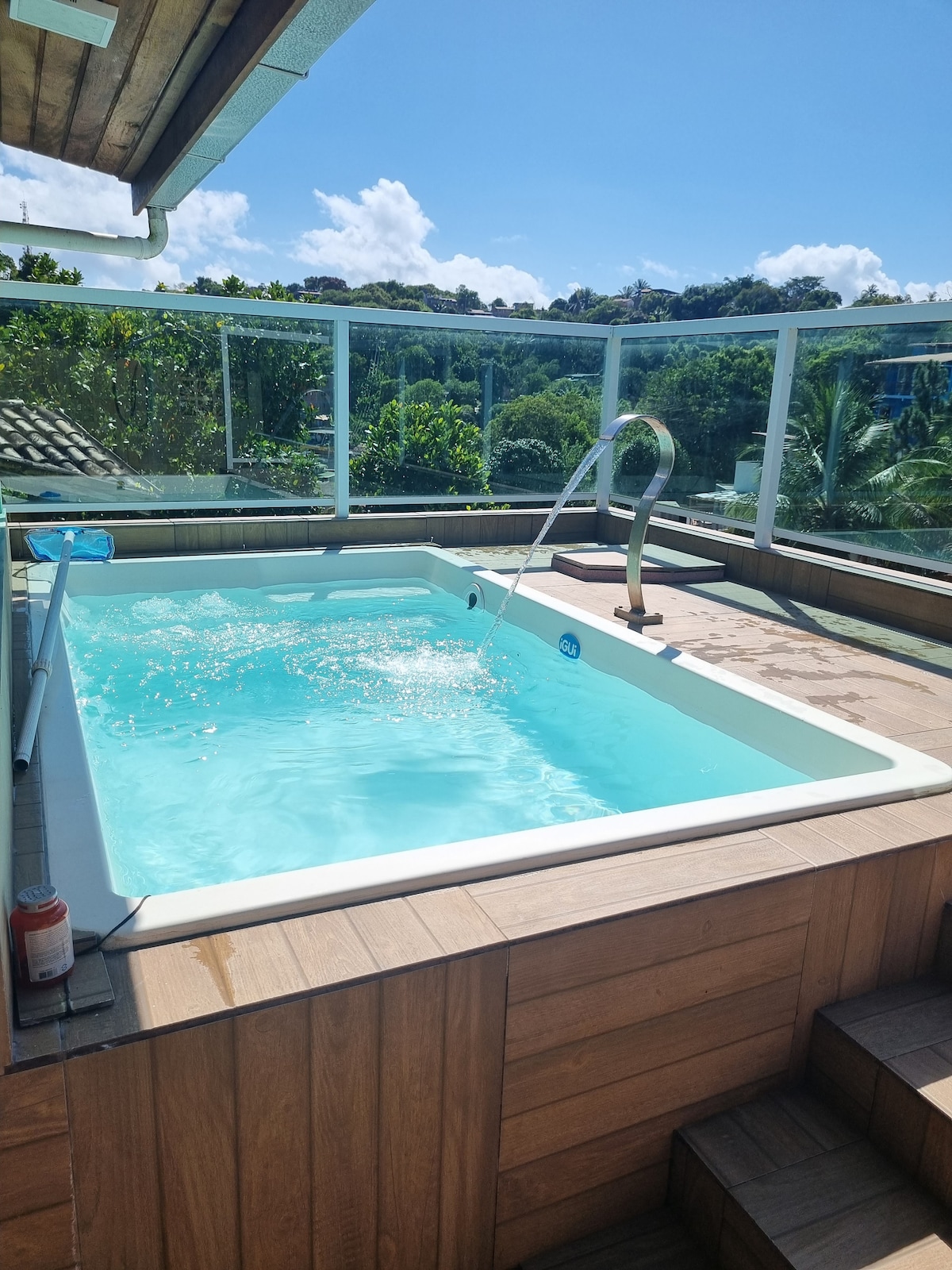 No alto do Morro de São Paulo, o Canto das Águas é um refúgio com vista para o mar e o pôr do sol de tirar o fôlego. Da praça central até aqui é uma caminhada de 15–20 min (1km), com algumas ladeiras e degraus. A recompensa é toda beleza natural exclusiva e privacidade. Ideal para casais, amigos ou viajantes solo que querem acordar com o azul do oceano. Estamos a 80m acima do nível do mar, com acesso do condomínio às trilhas para as praias Porto de Cima, Ponta da Pedra, Praia da Argila e Gamboa.