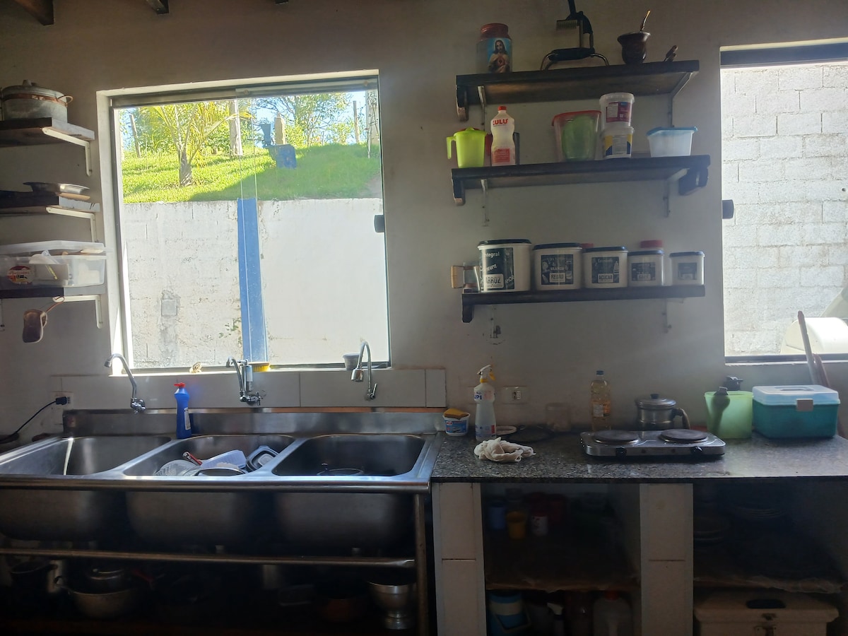 Chácara num lugar tranquilo e agradável. Casa independente bem montada! Dois quartos com cama de casal. A casa e completa com roupas de cama,mesa e banho limpas e cheirosas! A cozinha, sala e lavanderia tb são completas! Tem cafeteira dolce gusto e deixo garrafas de água p chegada dos Nos quartos e sala tem ventiladores! No banheiro vc encontrará papel higiênico e sabonete e toalhas limpas p todos os hóspedes! A casa tem dois quartos um banheiro , uma cozinha conjugada com sala e lavanderia!