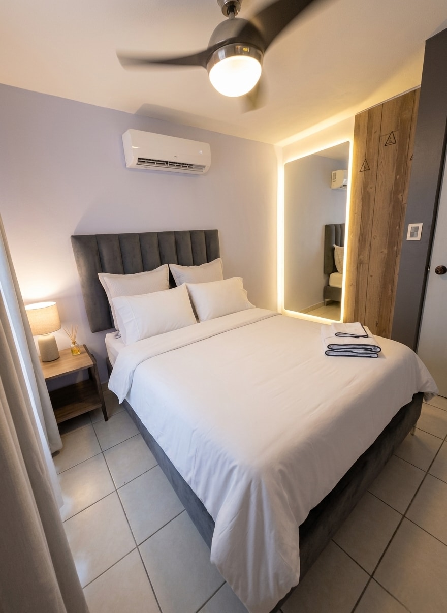 Diviértete con toda la familia en este alojamiento con estilo. Anímate a elegir entre 2 albercas, descansa en colchones ortopédicos en áreas climatizadas mientras ves tv, escucha música al cocinar/lavar y despierta tomando café para iniciar bien tu día. Todo mientras te sientes seguro: vigilantes y cámaras 24/7. Estacionamiento techado, HEB cruzando la calle, a 7 min de Paseo la Fé y a 20 min del aeropuerto.