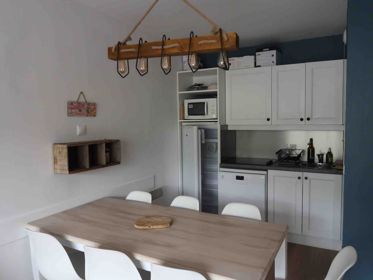 O apartamento em clima de chalé com materiais de qualidade (madeira, pedra). É composto por uma grande sala com cozinha aberta equipada, sofá-cama de casal, TV e arrumação. ⁃ Quarto pequeno com armário grande e beliche ⁃ Banheiro e toalete separados Apartamento de 28 metros quadrados localizado a 50 metros do centro e da frente de neve. Tem varanda com exposição sul e vista para a montanha. O bloco de apartamentos é tranquilo e seguro. Armário de esqui está disponível.