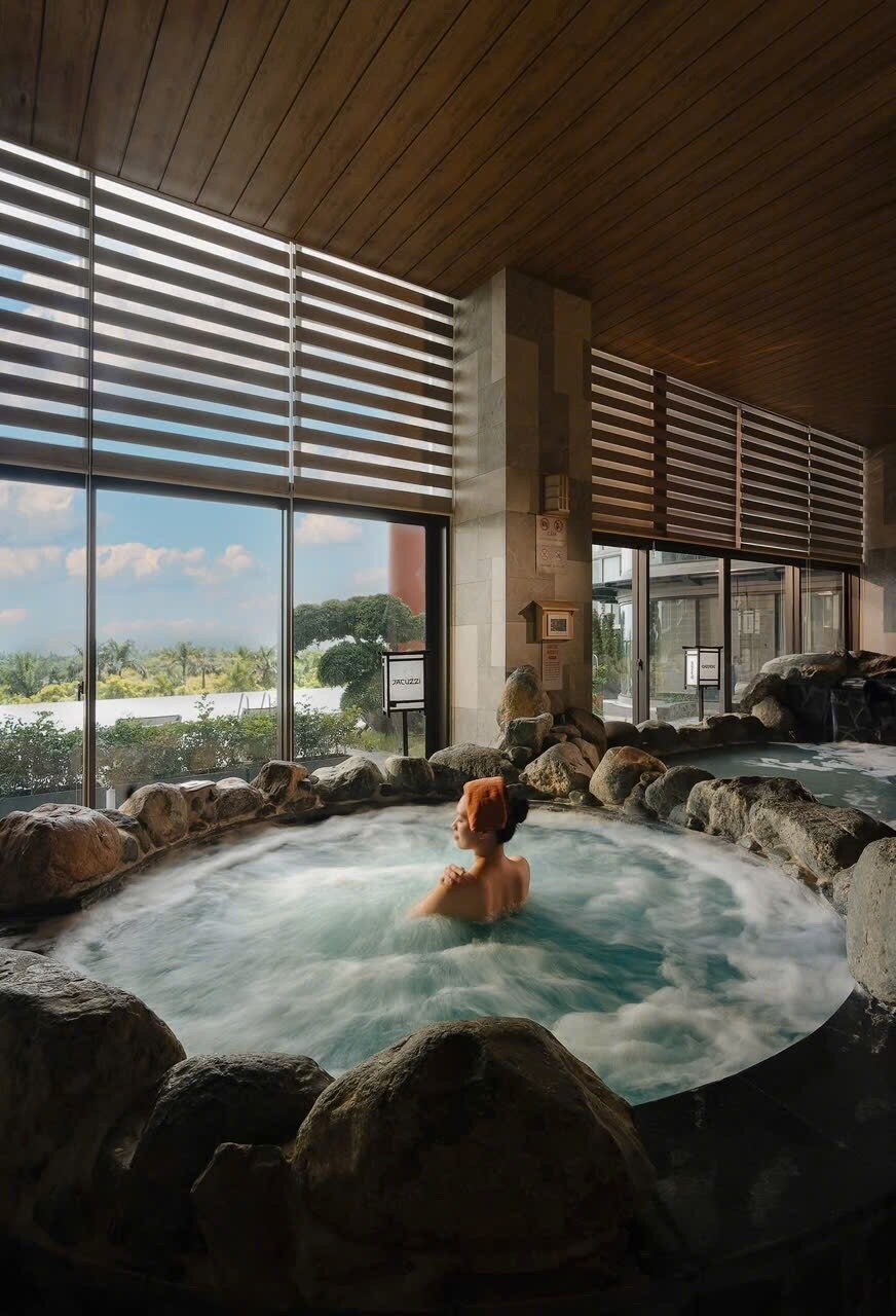 Apartamento com banheira e vista para o lago onsen do Ecopark.