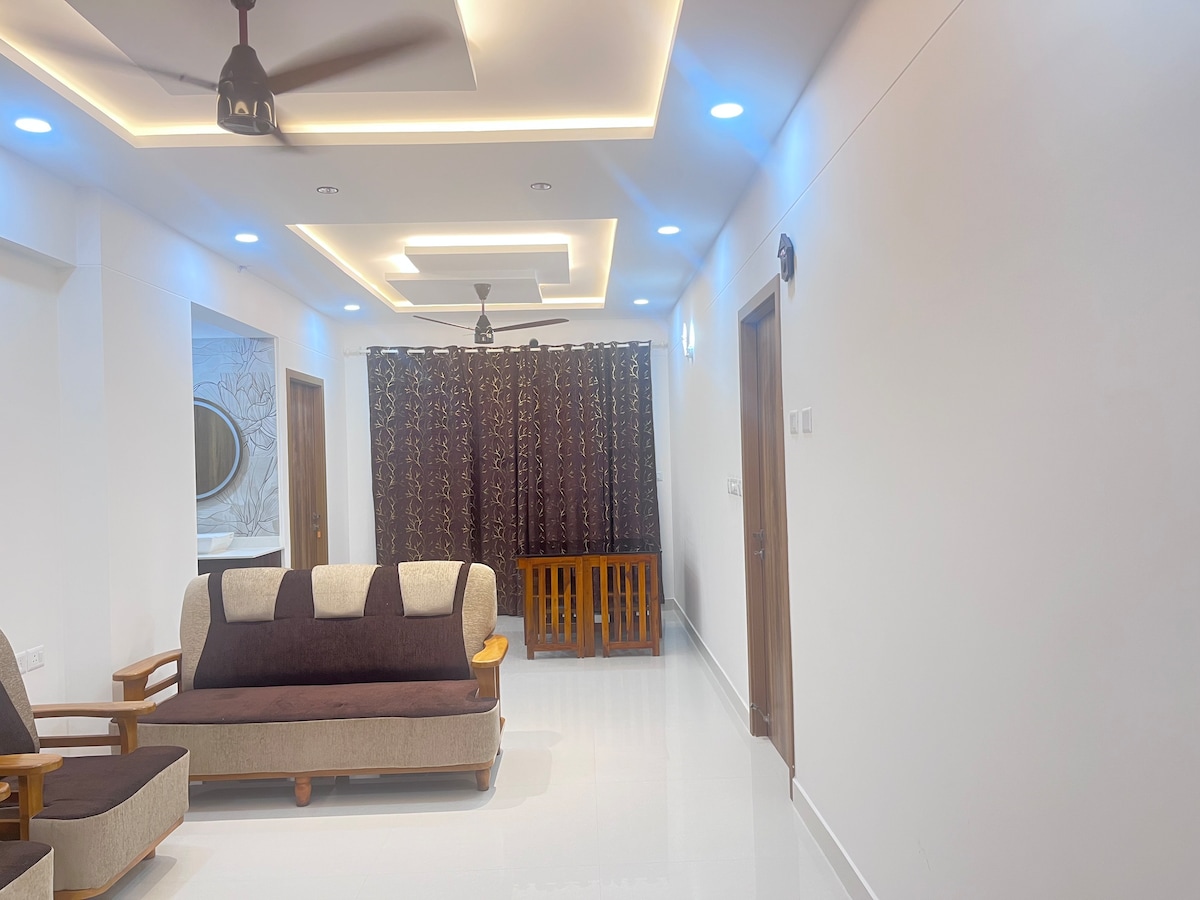 Apartamento luxuosamente mobiliado de 3 quartos acomodando 5 pessoas com ótimos interiores, cozinha moderna, A/C, TV, geladeira, aquecedor de água e eletrodomésticos modernos. Oferecemos Wi-Fi gratuito, estacionamento, água potável, produtos de higiene pessoal, toalhas, chá/café. Localizados em Kowdiar, nossos apartamentos se beneficiam de um ambiente tranquilo em uma das áreas residenciais mais ricas de Trivandrum, com acesso rápido ao Aeroporto/Estação de Trem, comodidades da cidade. Aceitamos hóspedes de todos os países e nacionalidades.