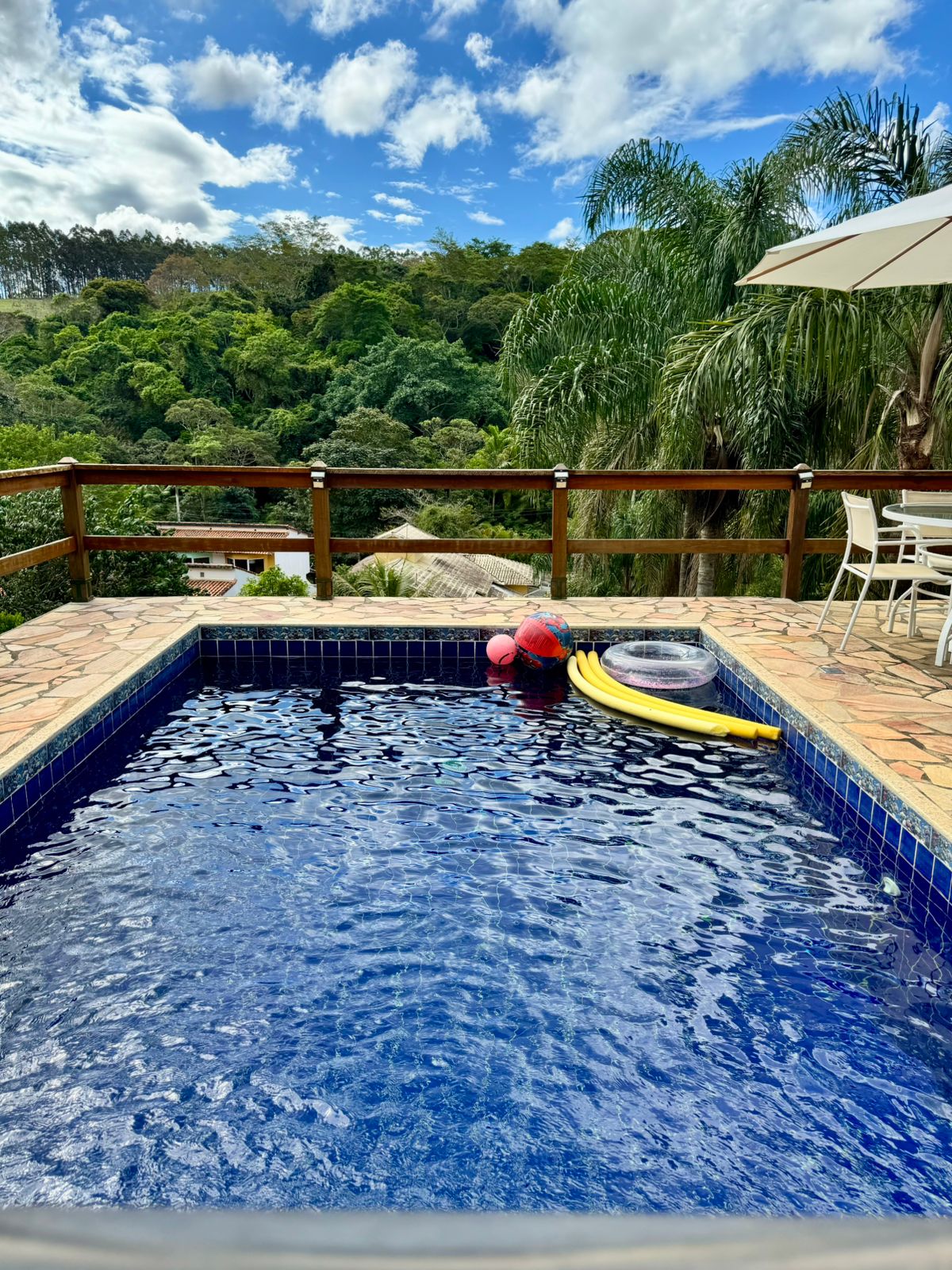 Relaxe com a família nesta casa tranquila, em centro de terreno, estacionamento, jardim e piscina aquecida, toda murada, em bairro nobre e tranquilo, próximo ao centro de Miguel Pereira. Com varanda, sala de jantar, sala de estar, cozinha, três quartos e dois banheiros. Duas suítes externas completam um total de 5 quartos. Terreno gramado ajardinado em volta da casa, piscina aquecida, churrasqueira gourmet e pátio de estacionamento para até 4 carros. Roupa de cama e banho em todos os cômodos.