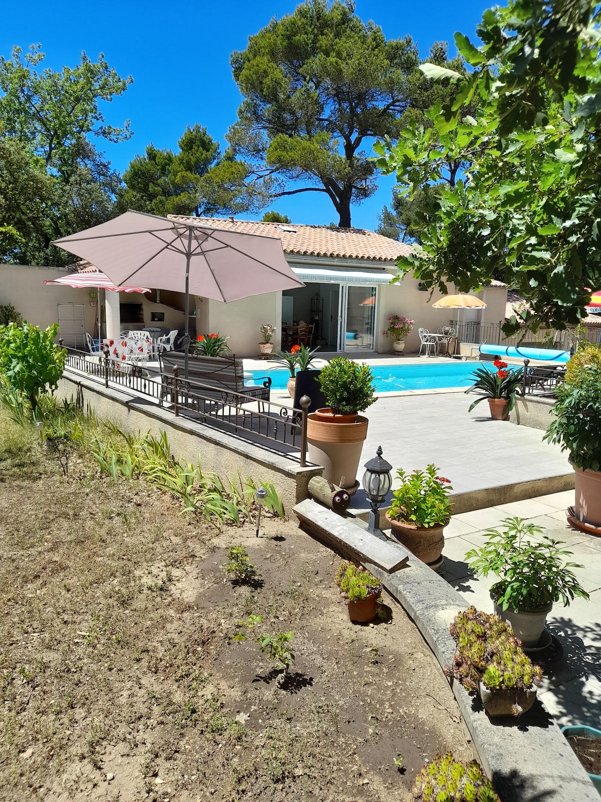 Mas à la campagne, composto por 4 apartamentos: 2 no andar térreo e 2 no andar de cima. Todos podem desfrutar livremente do jardim com piscina e quadra de petanca. O parque, com uma vista deslumbrante sobre o Monte Ventoux, as rendas de Montmirail e o planalto de Sault: é espaçoso (15000m2). As cadeiras, redes e espreguiçadeiras são numerosas. Quer você prefira sombra ou sol, todos encontrarão sua privacidade. Escondido dos olhos e longe do turismo de massa, você estará em total desconexão!