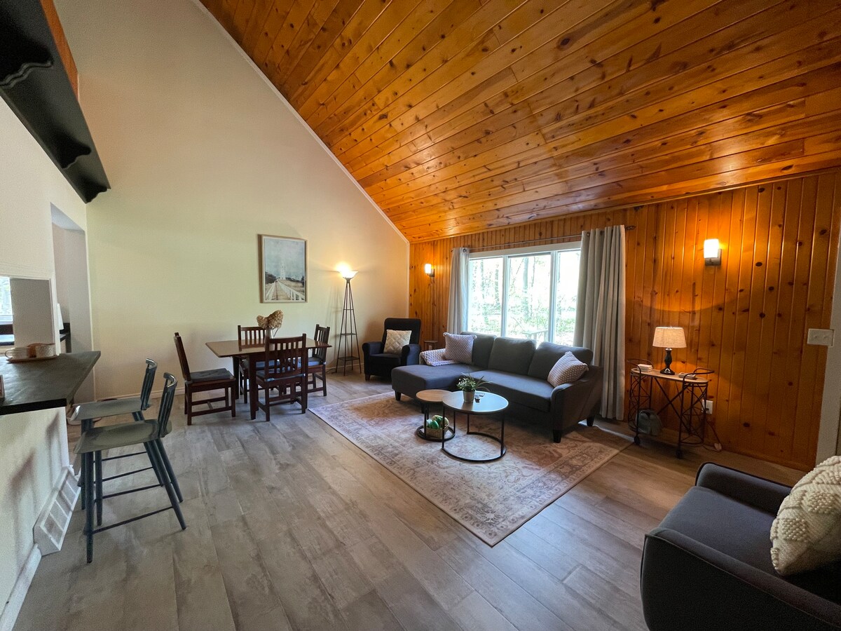 Vista infinita de alto penhasco com vista para o Lago Huron. Você vai adorar a sua estadia por causa do equilíbrio perfeito de atividade ao ar livre e oportunidade de comungar com a natureza. As comodidades incluem dois caiaques, uma grande fogueira ao ar livre, lareira interna, praia privativa e cidades portuárias próximas para explorar. Bom para casais e aventureiros solitários, esta casa de campo de teto alto em pinheiro nodoso no Lago Huron tem uma cozinha completa com belas bancadas de quartzo e portas francesas para o quarto.