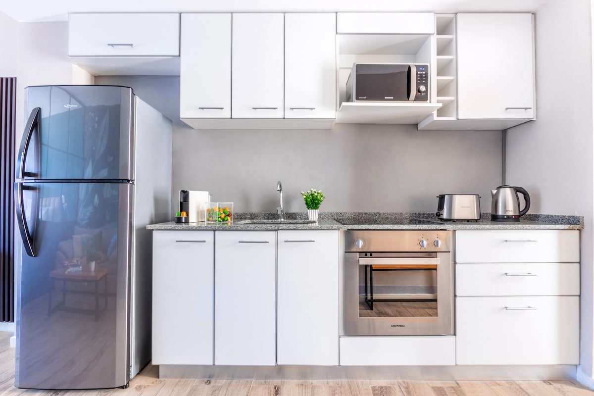 Estúdio novo e ensolarado para 2 | cozinha + lavanderia