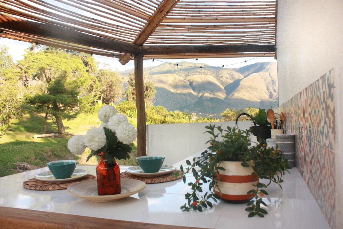 Relaxe com seu parceiro, família ou grupo de amigos nesta casa confortável, aconchegante e bonita, localizada a 8 km da Villa de Leyva, via Gachantivá, com uma vista de 360° de belas paisagens panorâmicas, tem Wi-Fi, dois quartos cada um com uma cama de casal, sala de estar, sala de jantar, cozinha totalmente equipada e banheiro com água quente, perto de um rio para caminhadas ecológicas e atrações, como as Ruínas, Parque de Aventura, Honda Falls, o Hayal, Laguna la Colorada, os Yatars, somos PetFriendly!
