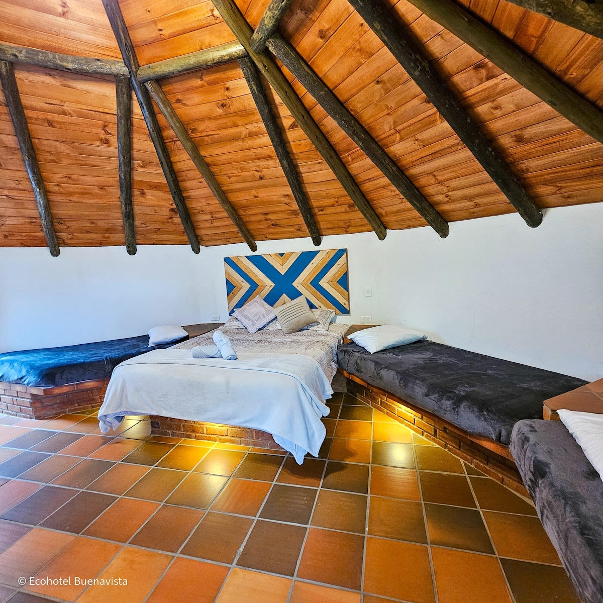 Maloka Tierra é a construção mais recente do nosso alojamento em Montecatini, uma propriedade na montanha de Villa de Leyva com quatro malokas inspiradas nos elementos da natureza. Esta maloca honra a força e a estabilidade do elemento terra, convidando-nos a criar raízes e nos reconectar com o essencial. Sua arquitetura circular, sem paredes, é inspirada nas malocas ancestrais, promovendo a união e o compartilhamento em harmonia com os outros e o meio ambiente.