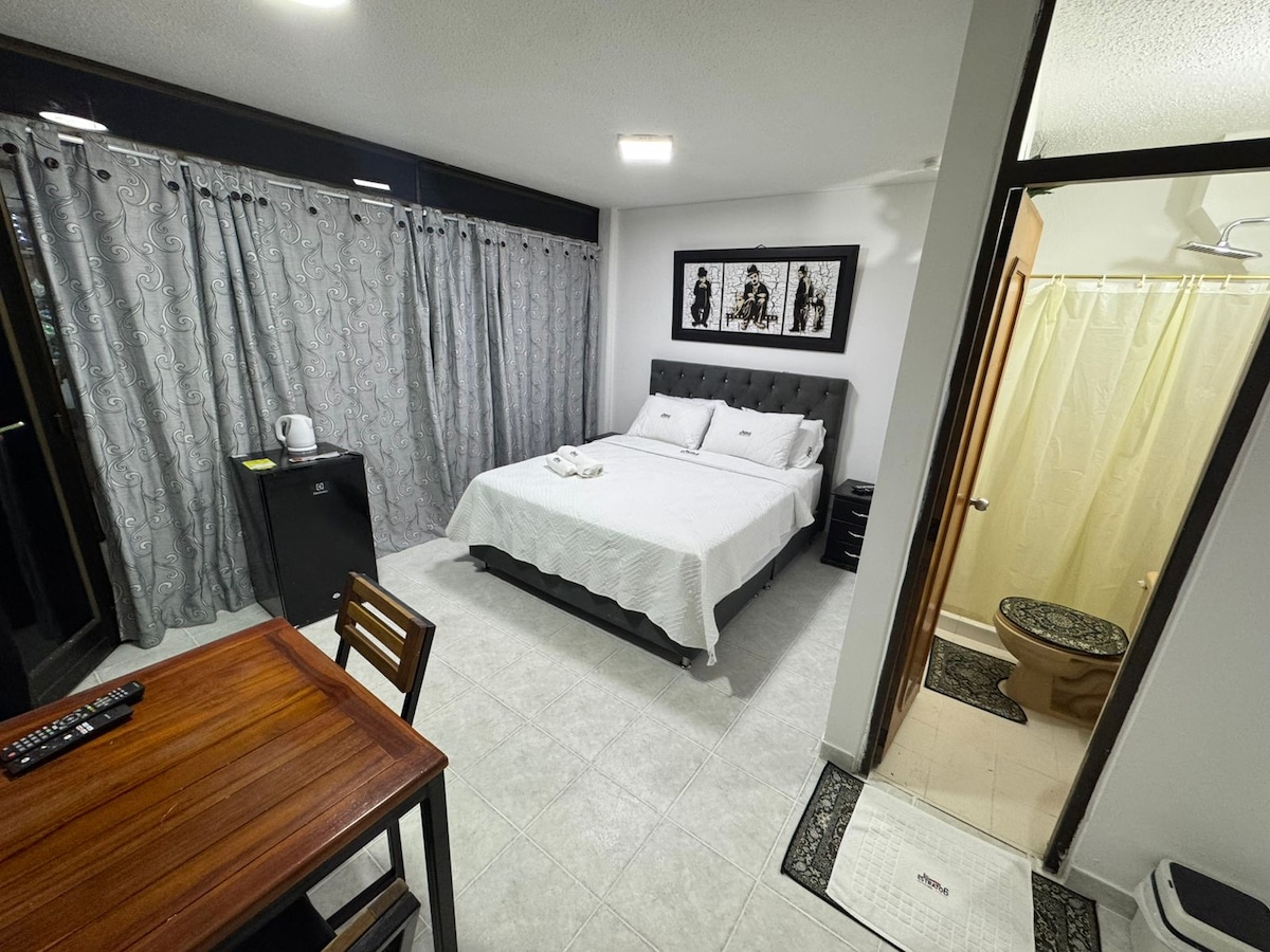Ubicación centro Dormitorio principal para dos personas con A/C TV + Netflix + Wifi Escritorio junto a la ventana Closet con cajonera y colgador de camisas Sala con sofá cama mesa centro Lampara de pie Comedor para 5p Cocina integral con estufa de 2 hornallas Ollas platos vasos tasas y utencillos de cocina de todo tipo. Hervidor de agua/licuadora/plancha/Microondas Nevera tipo minibar Baño con agua caliente / fría Secador de pelo
