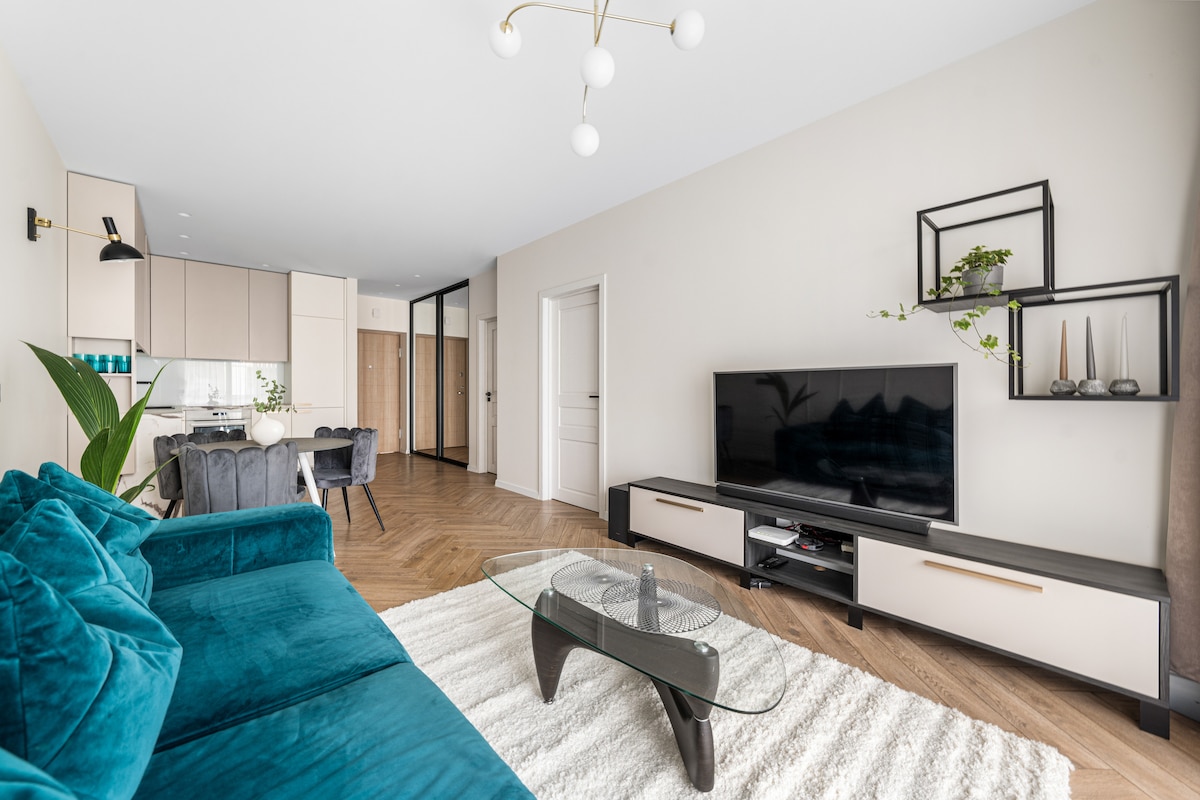 O apartamento está localizado em uma área recém-desenvolvida ( Vilnius Business Center), perto da cidade velha. Fica a 9 minutos do jardim japonês, a 25 minutos a pé do centro histórico, a 10 minutos a pé do shopping EUROPA. Apartamento decorado em estilo escandinavo - aconchegante, leve e moderno. Tem 49 m ², tem quarto separado, sala de estar com cozinha, varanda. Ótimo para ficar até 3 pessoas - de lazer a trabalho ou estadias mais longas! O estacionamento é na rua, pago 1€/1h de segunda a sábado (8:00 - 20:00)