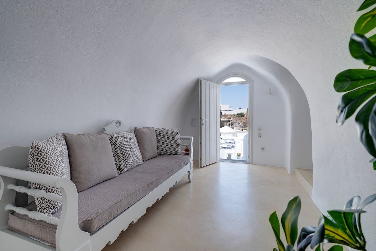 Esta vila única está localizada no coração de Oia em uma excelente posição e tem vistas deslumbrantes. As famosas Três Cúpulas em frente à vila com vista panorâmica para a caldeira santoriana e o mar Egeu, têm atraído visitantes e fotógrafos de todo o mundo, tornando-se o local mais popular em Santorini. A vila está em perfeita harmonia com o ambiente natural da área e segue os princípios da arquitetura tradicional das Cíclades.