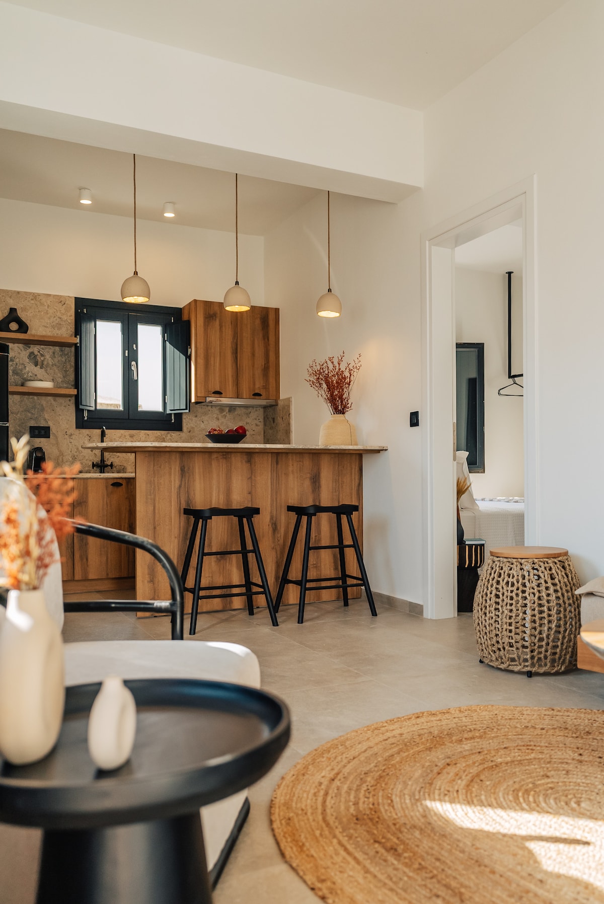 Uma bela vila com arquitetura tradicional e moderna, no centro da tradicional vila de Pyrgos Kallistis, com total privacidade e estacionamento privativo bem em frente à vila. A apenas 250m da praça central da vila de Pyrgos, a 5km de Fira, a 7km do aeroporto internacional de Santorini e a 5km do porto. Quarto espaçoso, sala de estar, banheiro com chuveiro, wc, cama king size, varanda privativa com sala de estar e piscina privativa, com vista para o mar.