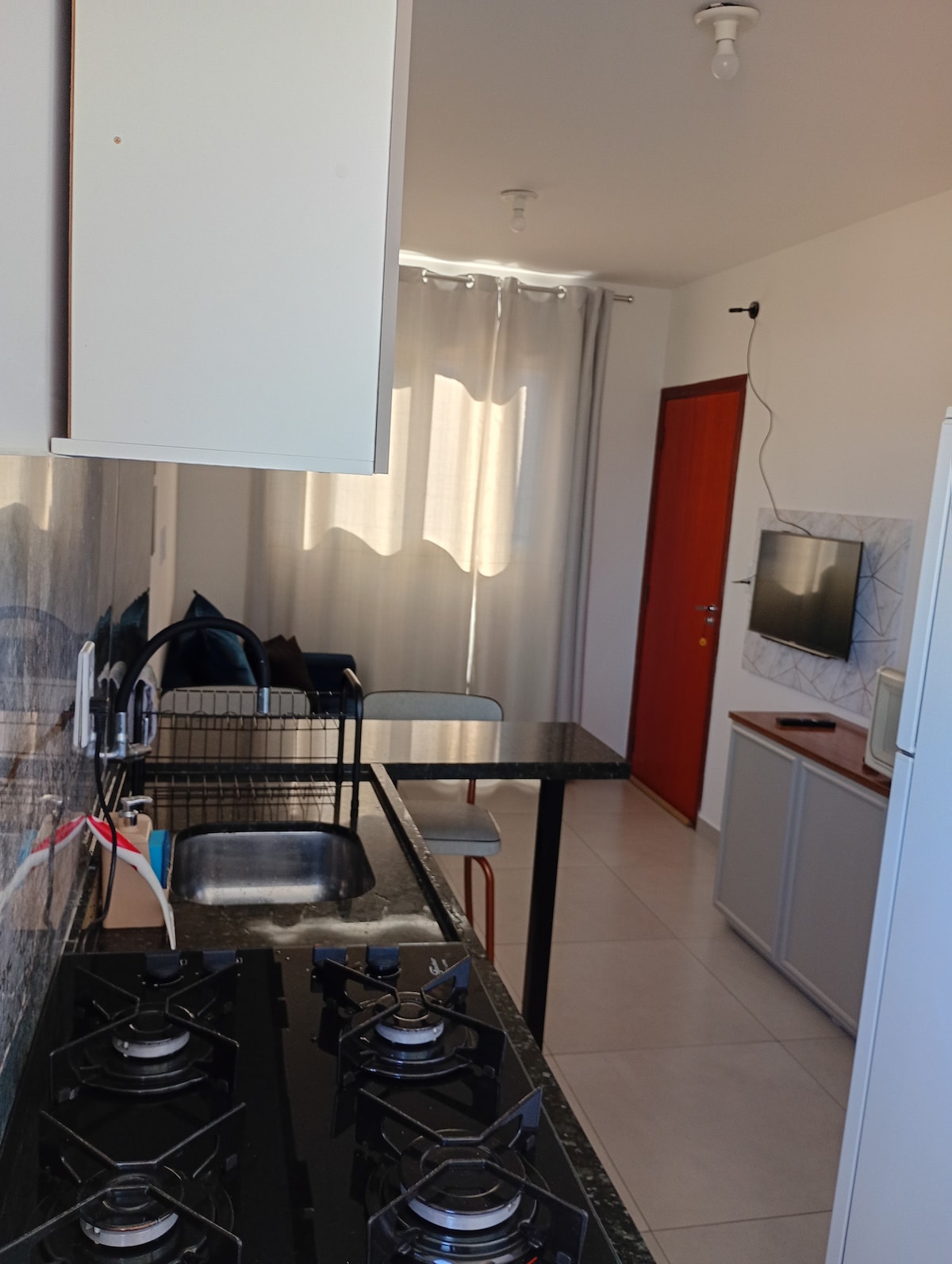 Kitnet completa, com ar condicionado, muito aconchegante. Próxima ao BOS, PUC e outros hospitais, rodoviária, centro da cidade, terminais de ônibus, shoppings, zoológico etc. Conta com internet gratuita, Smart TV com suporte articulado, cozinha equipada com os principais utensílios, fogão elétrico 2 bocas, móveis planejados, tudo p/ o maior conforto do hóspede. Fornecemos roupa de cama e banho. P/ reserva acima de 15 dias deixamos 1 jogo de cama e de toalhas a mais. A kitnet não possui garagem.