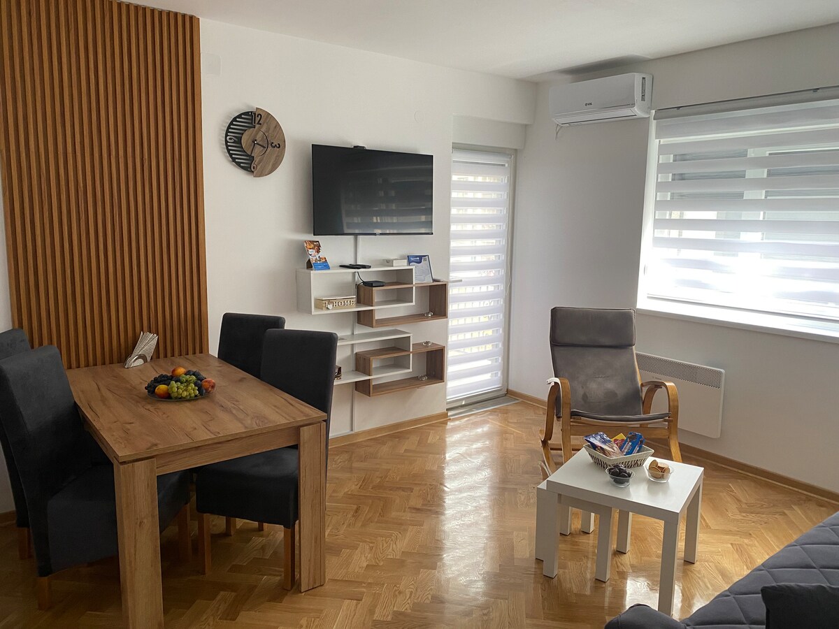 Apartamento iluminado e elegante no centro de Vrnjacka Banja, com elevador, estacionamento, vista panorâmica e um grande terraço - ideal para trabalhar, criar conteúdo, relaxar e para famílias com crianças pequenas.
