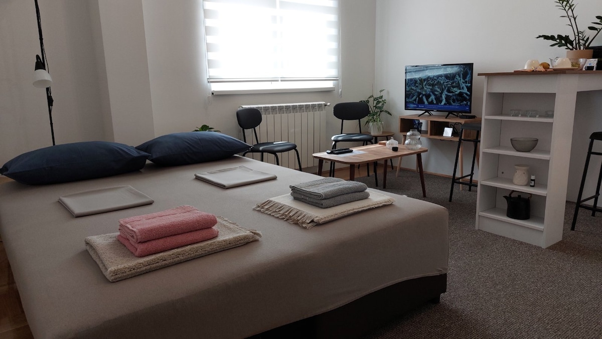 Naš cilj je da stvorimo prostor u kome se gosti mogu opustiti i prijatno provesti vreme tokom svog boravka. Zato je ovaj studio apartman uređen u minimalističkom, ali toplom i funkcionalnom stilu, sa svim osnovnim sadržajima potrebnim za udoban boravak.