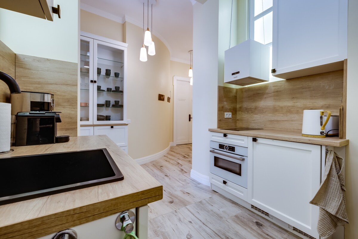 O apartamento fica no centro histórico da cidade e até 3 pessoas podem encontrar um lugar nele. Os equipamentos da cozinha são MW, fogão de indução, chaleira elétrica, máquina de lavar roupa, aquecedor elétrico de água, geladeira, chá, café, açúcar, sal e pimenta, filtro para água potável. Os hóspedes podem usar Wi-Fi gratuito, TV LED, secador de cabelo, ferro, tábua de passar roupa, ventilador de quarto com um relógio de temporizador e três posições em energia. Os hóspedes recebem conjuntos descartáveis: pasta de dentes e escova de dentes, géis de banho e xampus, sabonete.