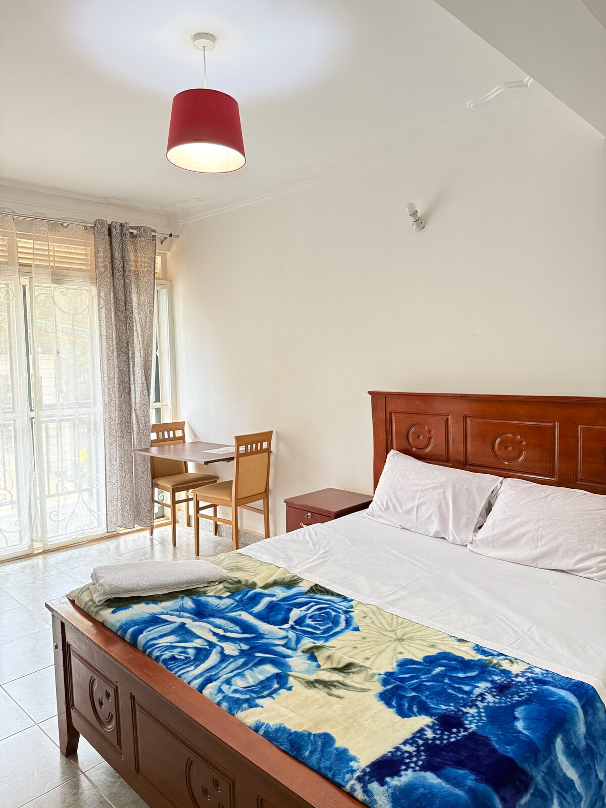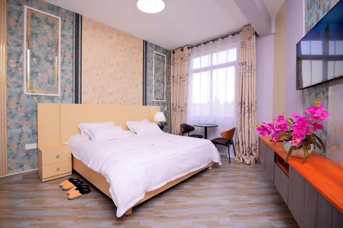 Quarto Standard NOAZ Boutique O NOAZ Hotel oferece confortáveis quartos Standard na tranquila área de Kungu/Kulambiro, cada um com varanda privativa e vista para a cidade de Kampala. Os quartos dispõem de cama king size, banheiro privativo, Smart TV, Wi-Fi rápido, café da manhã gratuito, serviço de lavanderia gratuito, estacionamento seguro e check-in 24 horas por dia, 7 dias por semana. Os hóspedes também podem solicitar traslados do aeroporto (UGX 150.000 por viagem) e desfrutar de sessões de massagem com desconto. Ideal para casais e viajantes de negócios que procuram uma estadia tranquila em Kampala.