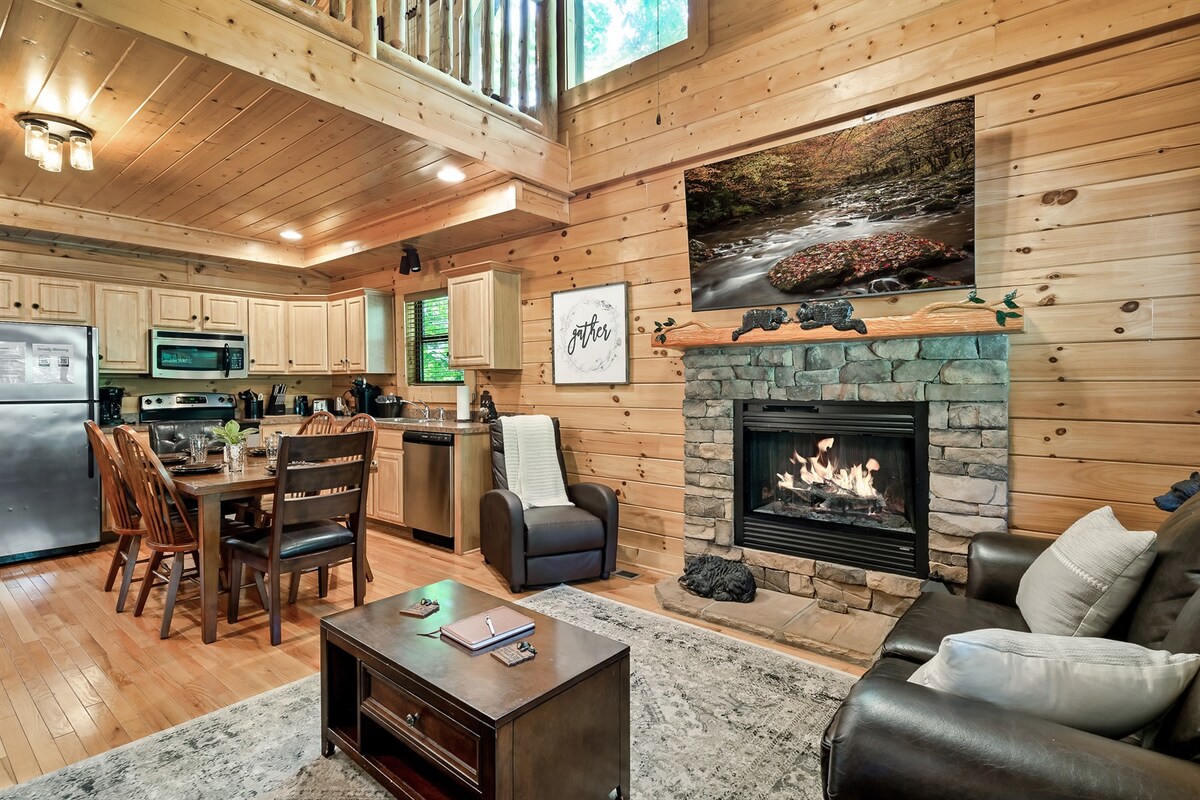 Veja por que esta cabana tem os 5% melhores no Airbnb! Lindo, 1 milha para a estrada e a ilha! 2 suítes King Master espaçosas para uma noite tranquila. 2 banheiros privativos completos, sofá-cama, sauna, banheira de hidromassagem, sala de jogos e lareira! MUITAS comodidades. Você vai adorar este 1 andar aberto, 3 conjuntos de portas francesas para a varanda privada. Relaxe na varanda da frente com vista para o vale ou aproveite a banheira de hidromassagem no grande espaço do quintal. O espaço de estar tem tetos altos e uma lareira aconchegante para um retiro.