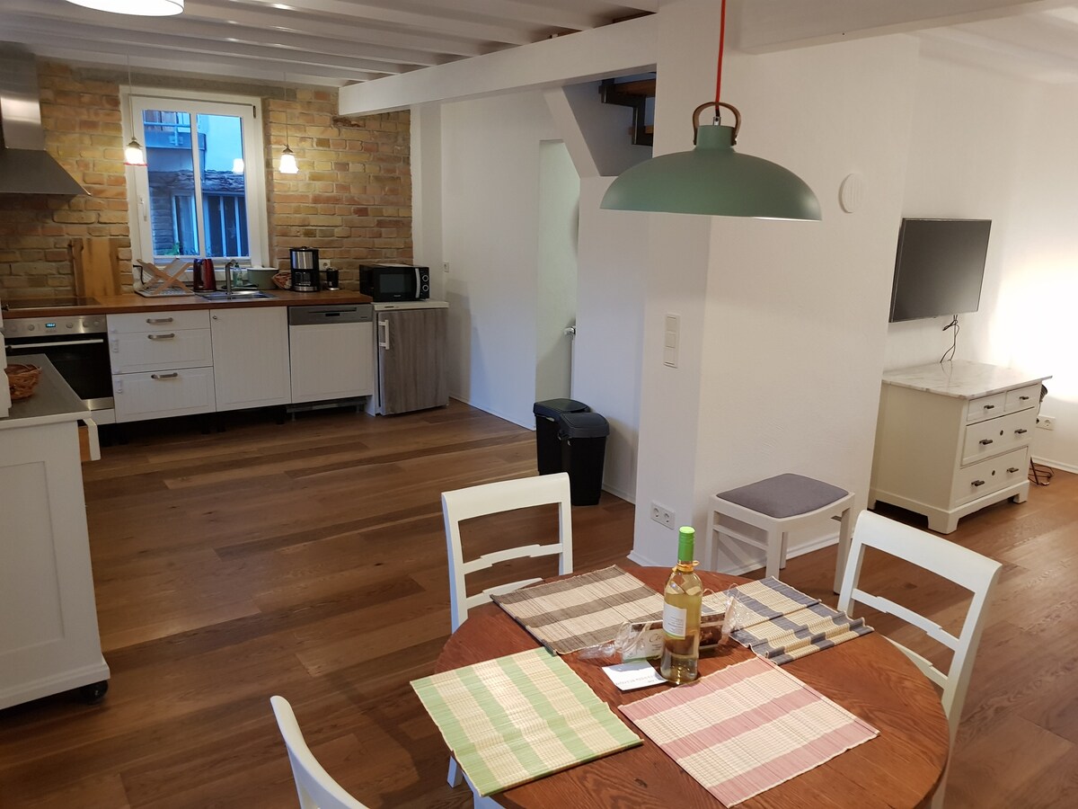 Nosso apartamento em estilo loft recém-reformado e muito espaçoso está localizado no centro de uma bela vinícola antiga no coração de Rüdesheim. Todas as atrações estão bem na esquina. Em apenas alguns minutos, você pode chegar às principais atrações, como a estação de teleférico, a famosa "Drosselgasse" ou começar sua caminhada até o monumento Niederwald. Mesmo com uma localização central, o apartamento oferece privacidade e tranquilidade. Tudo o que você precisa para uma estadia relaxante em Rüdesheim.