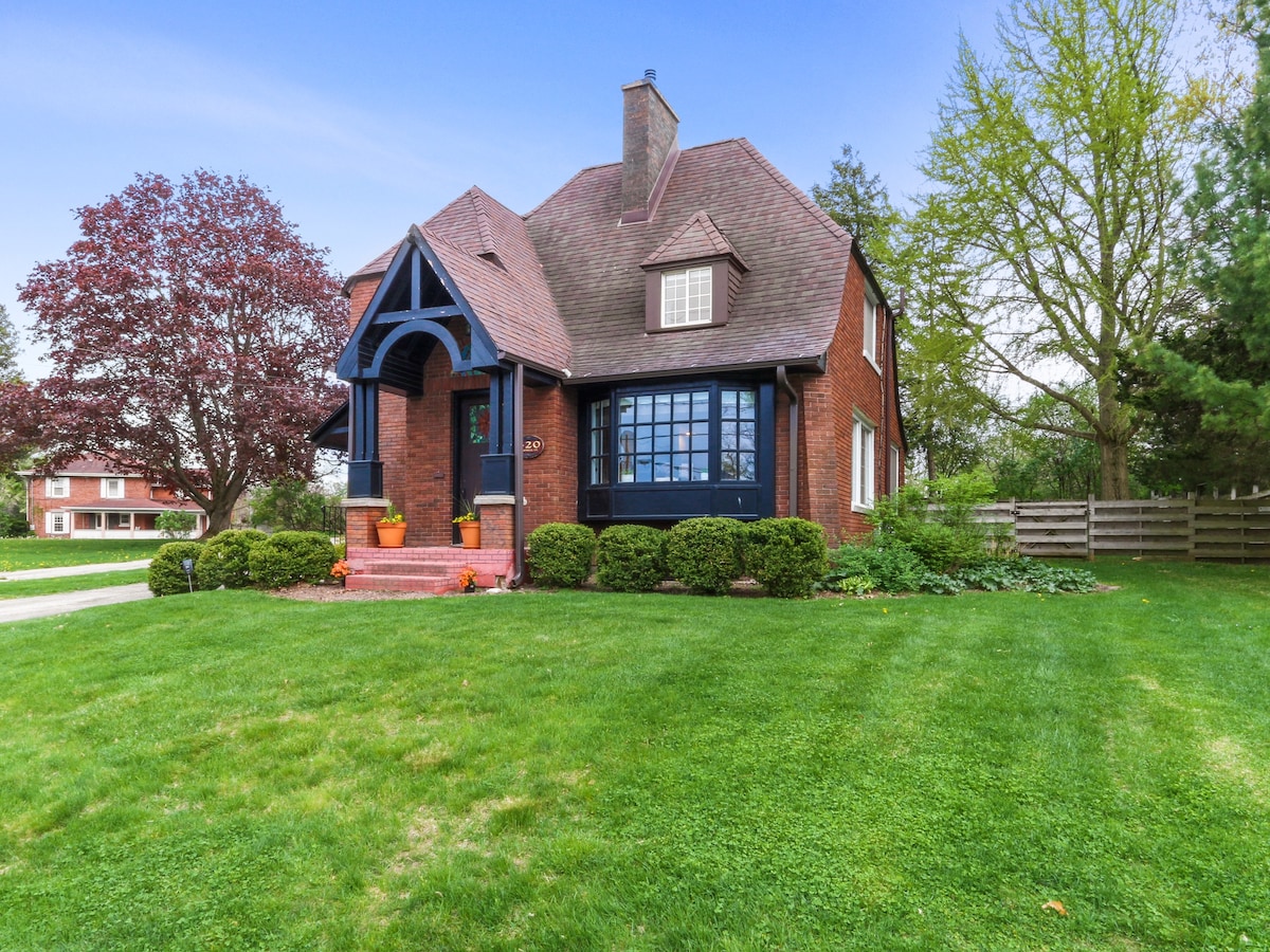Chalé vintage renovado fica a quarteirões do lago, a 4 quarteirões da praia da Riviera e a uma curta caminhada do centro da cidade. A casa de campo deslumbrante possui vitrais originais com cozinha renovada deslumbrante, incluindo bancadas de granito e eletrodomésticos de aço inoxidável. Cozinha totalmente abastecida com pratos, utensílios, panelas, frigideiras e tigelas. Armários e gavetas claramente rotulados. Pratos, tigelas, copos e utensílios infantis. Muitos jogos, brinquedos, quebra-cabeças e livros para crianças também! Mesa de pátio ao ar livre.