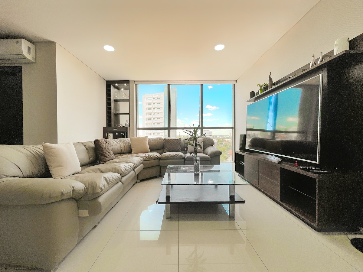 Desfrute de um apartamento exclusivo no coração de Santa Cruz, na Av. Los Cusis. Tem 3 quartos, cozinha moderna, sala de estar com vista panorâmica e varanda, TVs, serviço de Internet Wi-Fi e Magis TV, utensílios de cozinha e roupas de cama. Também temos estacionamento gratuito para nossos hóspedes. Relaxe nas áreas sociais: piscina de borda infinita, churrasqueiras, academia e muito mais. Faça deste espaço elegante e confortável o seu lar temporário ideal.