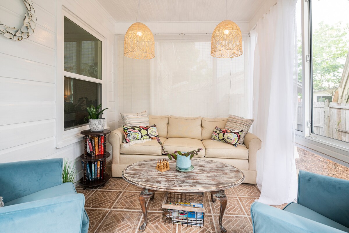 Relaxe neste bangalô calmo e cheio de estilo. Muito perto de NAS Pensacola, a 2 quarteirões do belo bayou (muitas vezes cheio de golfinhos) e um parque com trilhas para caminhada. Traga seu caiaque! Você pode muito bem ver os Blue Angels praticarem nesta casa limpa e elegante, cheia de muitas pequenas comodidades! As camas são super confortáveis. O bairro é tranquilo e seguro. A praia de Perdido Key fica a apenas 15/20 minutos de distância! Praias de areia branca. Cozinha totalmente abastecida e fornecida, solário encantador, deck grande