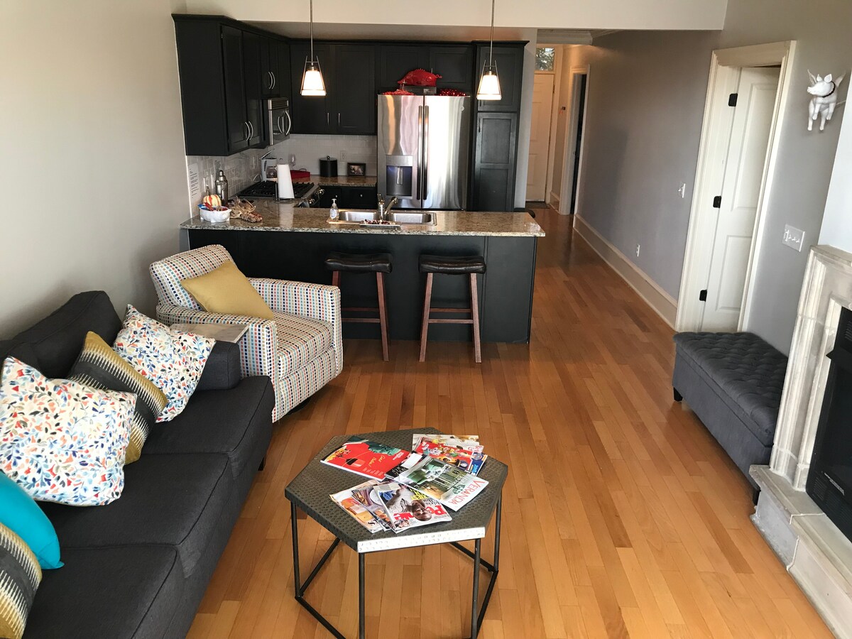 Condomínio de 1.079 pés quadrados no coração de Fayetteville. Caminhe por toda parte na Dickson St. Não é necessário dirigir uma vez que você chegar, você pode caminhar ou andar de bicicleta. O condomínio vem com uma vaga de estacionamento dedicada/reservada. O quarto principal inclui 1 cama king size e uma cama de solteiro. O quarto de hóspedes é um beliche com colchão de tamanho duplo na parte superior e inferior. O sofá na sala de estar tem um sofá-cama. 2 banheiros completos com banheiras e chuveiros. WIFI, Smart TV 4K UHD de 49", cabo, geladeira/freezer de tamanho completo com máquina de gelo.