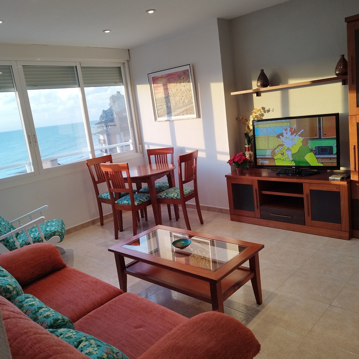 En este alojamiento se respira tranquilidad, relájate con toda la familia. Disfruta de las vistas despejadas al mar, montaña y la ciudad. El piso se distribuye en 1 salón grande, 1 comedor, 2 habitaciones, 4 camas, armarios, un baño. Cocina equipada con vitrocerámica, horno, nevera, microondas, lavadora, tostadora, cafetera. Aire acondicionado, wifi. Urbanización cerrada con jardín, 2 piscinas, 2 pistas de tenis, parque para niños y mayores. Un patio con patos y tortugas.