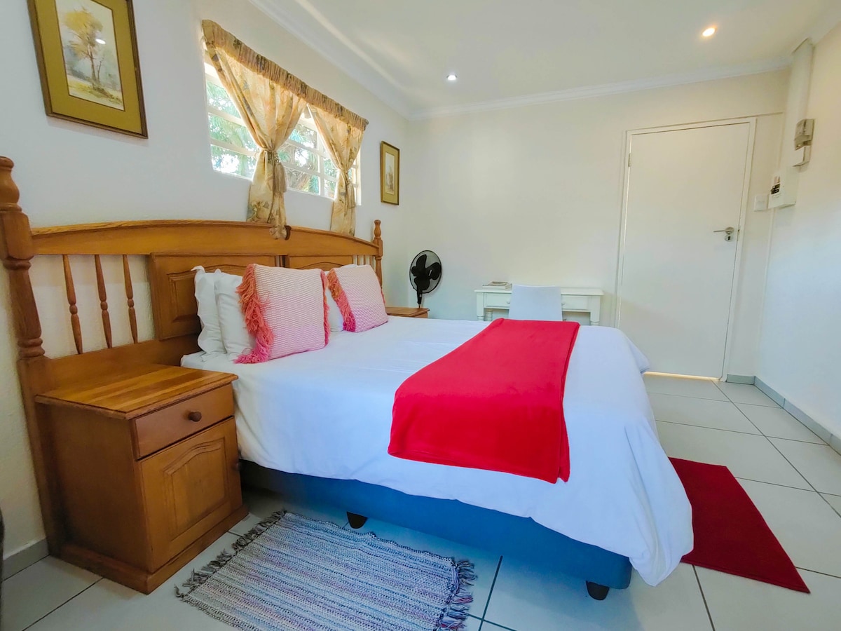 Airy and sunny level accommodation . Plenty of space to relax , while enjoying the highveld weather. Sit and enjoy your morning coffee in a colourful garden , Watching the bird life . New paved area with table and chairs, a braai on request. Please bring your own charcoal. Now with back up power ⚡️and water 💦
