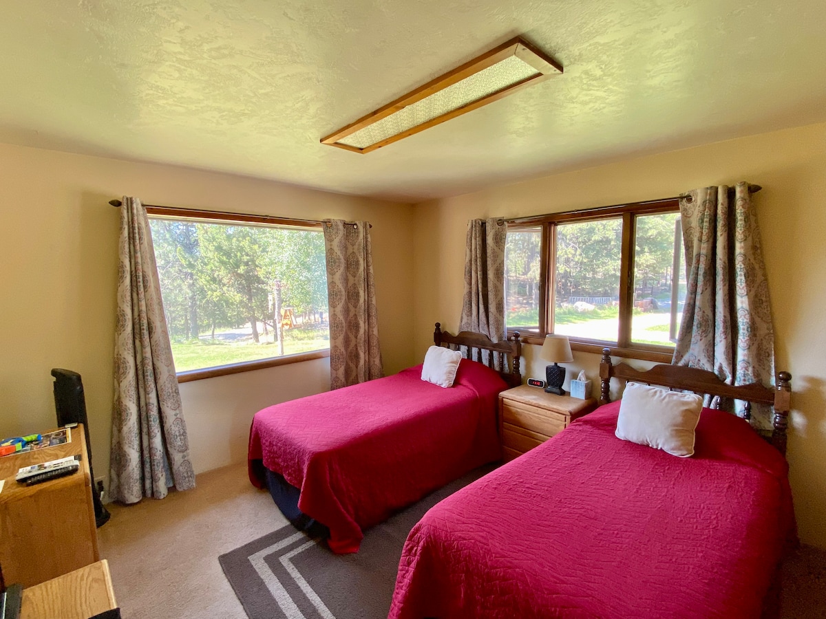 Suíte de hóspedes independente no piso térreo da Log Home. Propriedade privada cercada por uma antiga floresta de pinheiros Ponderosa. Dois quartos espaçosos, um banheiro grande, sala de estar e cozinha completa de nogueira personalizada com todos os novos eletrodomésticos de aço inoxidável e uma lavanderia. Muito pacífico, seguro e tranquilo. A estrada é uma estrada de terra estilo Montana. Quando não há neve, qualquer carro vai subir a colina. No inverno, você precisará de um veículo de quatro rodas. Nós limpamos a estrada conforme necessário no inverno. Nós aceitamos animais de estimação.