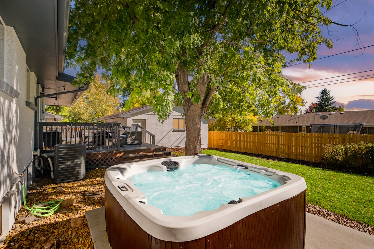 Imagine a stay that provides comfort, convenience, and is centrally located between Denver, Red Rocks Park, and Boulder. You’ve found it! Gather the group at Blossom Bungalow. Enjoy unique spaces, including a hot tub, movie room, pool table, putting green, sun/yoga/board game room, reading nook, dining booth w/ flower backsplash, along with fully equipped kitchen in the open floor plan. All topped off with streaming services & fast wi-fi.