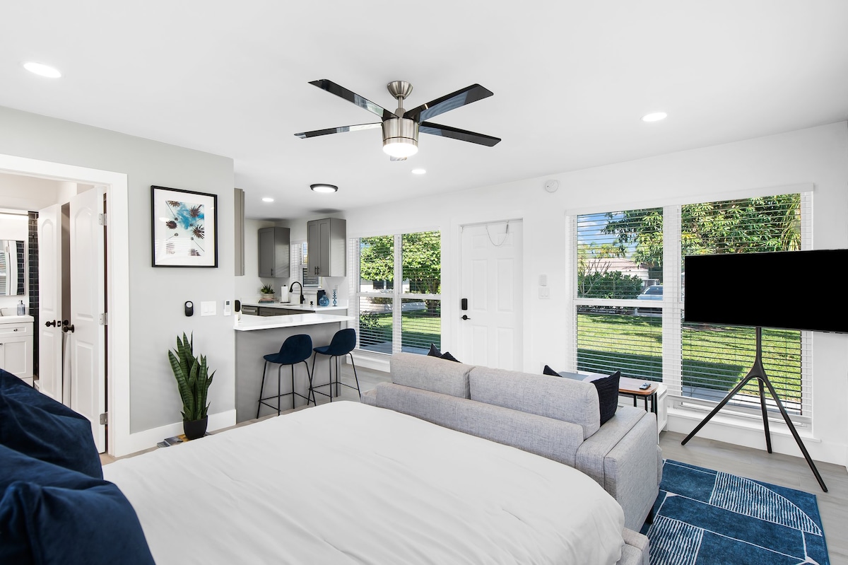 This is a newly renovated mid-century modern retreat in the heart of Pembroke Pines. This comfortable studio is ideal for short term stays, featuring a full kitchen, a beautifully updated bathroom, and a spacious living area. Unwind in a comfortable queen-sized bed and a futon that opens up to a double bed. Includes complimentary coffee, toiletries, fast WiFi, and a smart TV with streaming apps. Immerse yourself in comfort and style in this inviting space in vibrant Pembroke Pines.