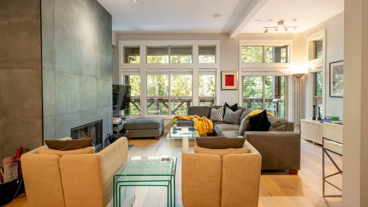 Acomoda 12 hóspedes muito confortavelmente em 4 quartos. Inverno de 2023: Renovado com novos móveis modernos de alta qualidade, Smart TVs, iluminação, pintura, tapetes e até mesmo uma lareira a gás controlada remotamente! Nossa espaçosa casa tem estacionamento gratuito, ar condicionado central e aquecimento, pisos aquecidos, tetos abobadados de cedro de 20' e muito espaço de armazenamento. A cozinha está bem equipada para todas as suas necessidades. No final do seu dia, aconchegue-se ao redor da lareira ou desfrute da sua banheira de hidromassagem privativa. Gerenciado por Superhosts experientes em Whistler.