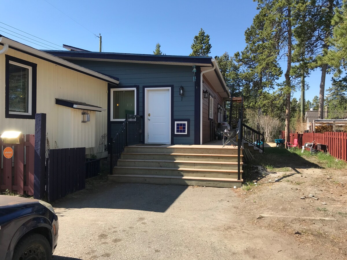 Suíte independente em um bairro tranquilo com cozinha completa, máquina de lavar/secar roupa e banheira. Perto de trilhas para caminhadas e ciclismo em Copper Ridge. Mercearia e pub nas proximidades. 10 minutos de carro do centro da cidade. Sofá-cama na sala de estar com lareira de propano. Animais de estimação são bem-vindos. Entrada privativa. Churrasqueira, pátio com mesa de fogo e canil cercado. Quintal cercado e banheira de hidromassagem estão disponíveis com aviso prévio.
